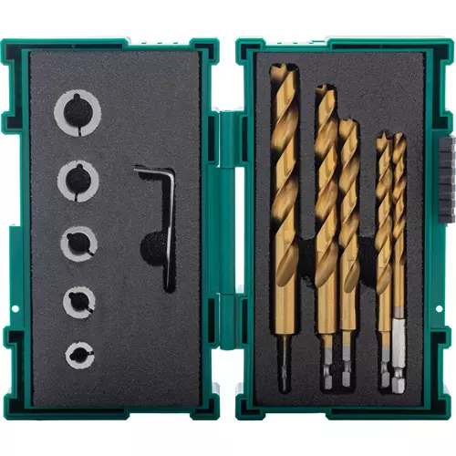 This drilling set offers several popular sizes so you can choose just the right bit for every job, and it includes a hex wrench and storage case.