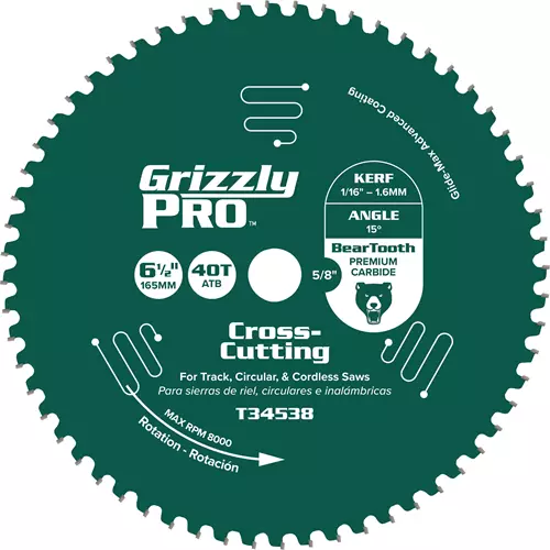 T34538 Grizzly PRO™ 6-1/2" x 5/8" 40T ATB Thin Kerf Crosscut Saw Blade