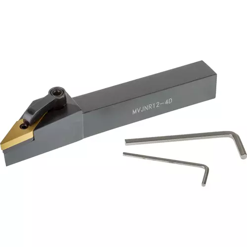 Uses 35° diamond VNGA, VNMA, VNMG, and VNMP 43 inserts. This tool holder has a 3/4" x 3/4" shank, 6" OA length, negative rake, and 3° side cutting edge angle.