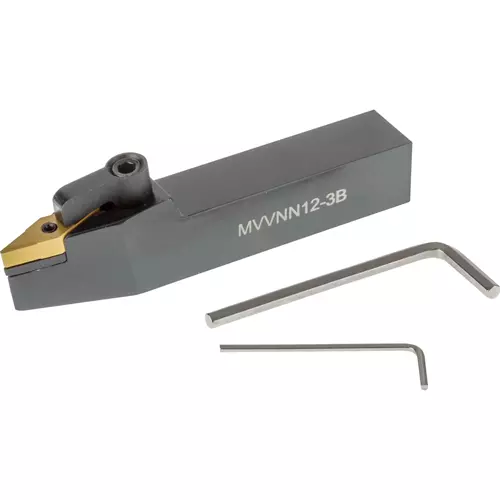 Uses 35° diamond VNGA, VNMA, VNMG, and VNMP 33 inserts. This tool holder has a 3/4" x 3/4" shank, 4-1/2" OA length, negative rake, and 17.5° side cutting edge angle.