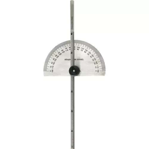 Quickly measure angles and depths with this stainless steel Protractor and Depth Gauge. The protractor is calibrated from 0 - 180° left and right and the depth scale is calibrated by 64ths of an inch up to 6 inches. A knurled knob locks settings for reading and transferring.