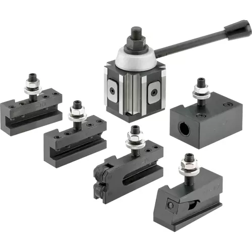 This tool post features a piston type mechanism and comes with five tool holders. These holders include: