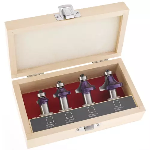 The most popular roundover sizes in one set. 1/2" Shank. Includes 1/8"r, 1/4"r, 3/8"r and 1/2"r. Complete with wooden box.