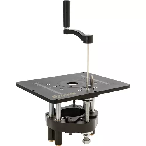 This manually operated router lift features a removable crank handle with a graduated dial for making ultra-precise height adjustments.