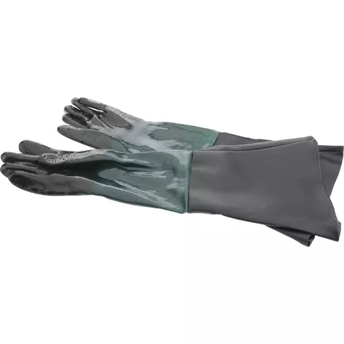 Industrial strength pair of rubber gloves with 11" cuffs protect from finger tip to elbow against damage while sandblasting. Positive grip on hands and fingers. Alkali