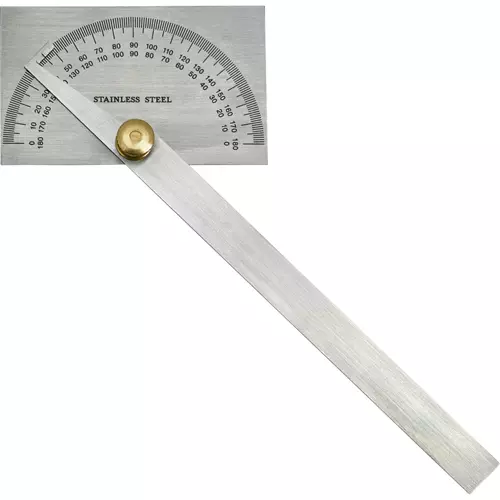Accurately measure angles from 0 to 180° with this stainless steel Protractor. Protractor scale is both left and right reading and the 6" long beam locks and unlocks with the twist of a brass knurled knob. This Protractor is always handy around the shop!