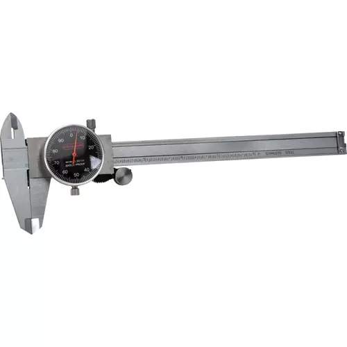 Easy to read black face dial caliper features .001" graduations, hardened and ground stainless steel main beam with hardened, ground and lapped measuring faces. Knurled thumb roll and 360 degree adjustable bezel make inside, outside and depth and step measurements quick and precise. Includes protective case.