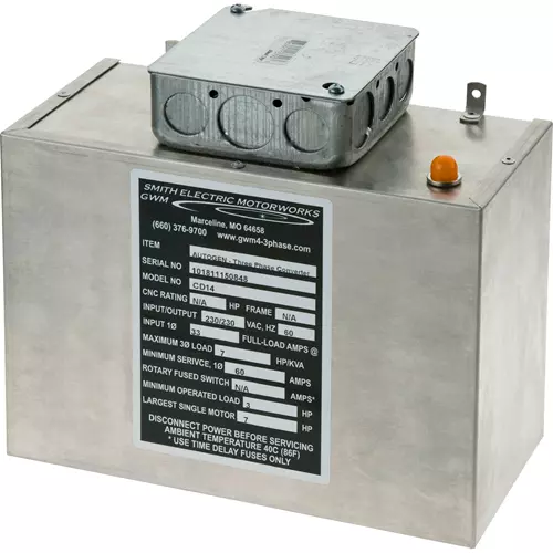Using patented solid-state starting relays, these Autogen Static Phase Converters allow you to operate moderate 3-phase loads on a single-phase circuit. Provides instant reversing and full-time 3-wire power on motors operated at 70% continuous HP or 90% intermittent-duty (15 minutes or less with equal motor-cooling time). Select a converter with a HP range that fits your 3-phase motor. For high start-up loads, choose the converter with the largest HP range that fits your motor. For heavy loads, high-duty cycles, or applications with digital controls, only use a Rotary Phase Converter.