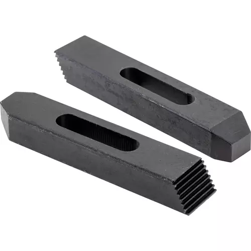 These heat treated steel step clamps with black oxide finish have teeth that are matched to fit any size step block. For 1/2" bolt size. Measures 6" long x 1-1/4" wide x 7/8" thick. Sold per pair.