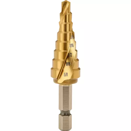 Easy to read, laser-etched hole diameters make drilling to exact sizes fast and efficient. TiN coated for extended durability, these Step Drills have hex shanks for quick-change chucks. Range is 3/16" - 5/8", steps in 8 x 16ths.