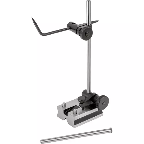This surface gauge is ideal for set-up, layout and quickly comparing parts. Supplied with precision ground V-notched bases, spring loaded fine adjustment knob, 1 long and 1 short spindle and adjustable base pins.