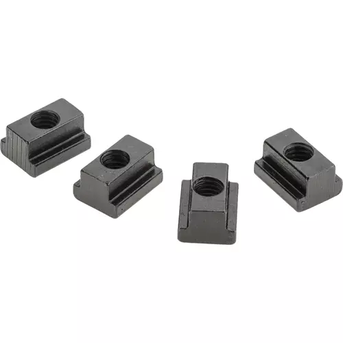 Heat treated steel T-Slot Nuts with black oxide finish feature an imperfect thread in the base of the T-nut to eliminate any danger of screwing the clamping stud through and damaging the table slot. Sold in packs of 4.