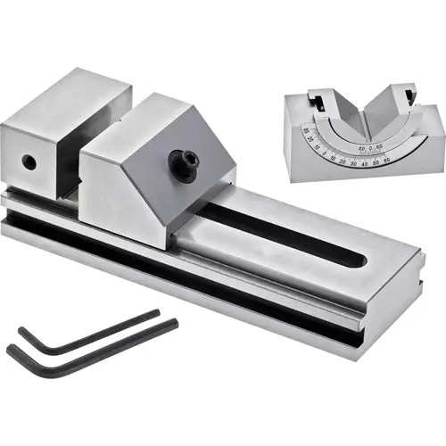 You'll have a tough time finding a Tool Maker's Vise with greater precision than this one. Features include a 0 to 5 1/4" capacity between the jaws, 2 15/16" X 1 3/8" jaw dimensions, full length clamping ledges and a stepped screw that pulls the moveable jaw down and in. The moveable jaw has horizontal and vertical V-grooves for round stock and the no-handle design makes this vise ideal for any milling situation. Comes with an angle V-block with 60 minute vernier scale and a protective wooden case.