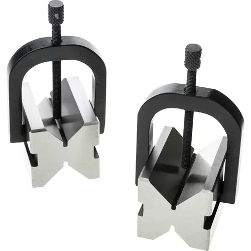 Numbered and matched V-Block Pairs with Clamps are precision ground for accuracy. DIN 2274 grade 2. 0.0004" accuracy. 2" x 1-1/2" x 1-1/2". 1-1/2" Capacity.
