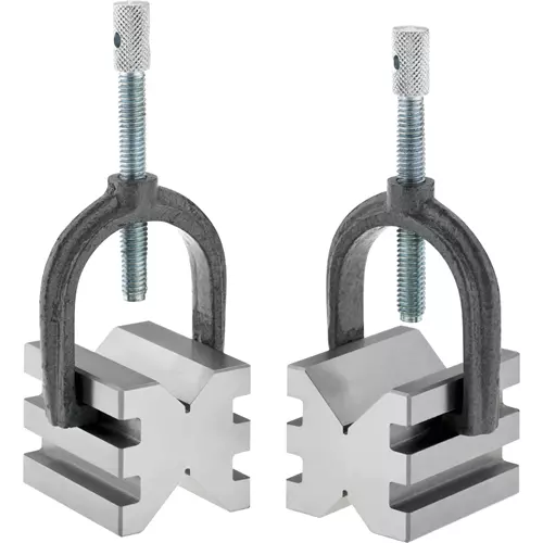These clamping V-Blocks feature double slots for extra clamping options. Hardened and ground to ensure accuracy and durability. Capacity 1-1/2" diameter and each measures 2" L x 1-9/16 W x 1-9/16 H.