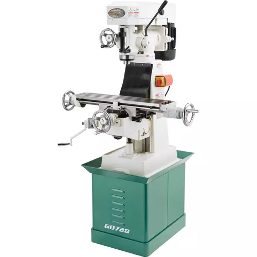 Simple, solid, and extremely accurate. This 6" x 26" Vertical Milling Machine is carefully built in Taiwan with heavy castings throughout for rigidity and accuracy. Just like larger and more expensive mills, the headstock tilts left or right 45° and rotates up to 90° in both directions, so you're not limited when it comes time to machine complex angles. To ensure maximum power for 110V operation, we used a 1-1/2 HP TEFC spindle motor. Speed changes are quick and easy with a stepped-pulley V-belt drive system. To keep table movement gliding effortlessly, all ways are lubricated with a one-shot oiler system. Available with or without longitudinal power feed. This is a very nice knee mill for those looking to step-up from a benchtop dovetail milling machine.