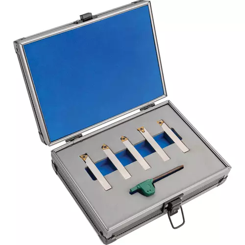 This indexable carbide tool set makes lathe setup and tool changes faster than with traditional tools. Featuring a standard 3/8" shank, this comprehensive, all-in-one set fits most mini-lathes and series 100 quick-change tool post holders. The versatile assortment provides the ability to cut and shape metal with precision, allowing for most common turning, facing, and profiling operations.