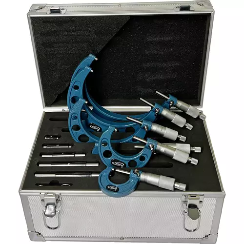 This vernier micrometer set from iGaging has 6 micrometers, 5 standards, and a spanner wrench enclosed in an aluminum case.