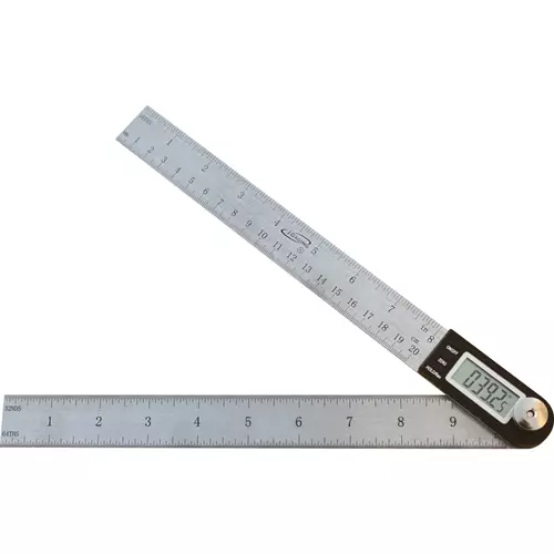 A 10" digital protractor with a stainless-steel rule blade offering inch and metric marking scales. A large LCD display shows degrees to assist with your measuring processes. The protractor includes reversible reading and hold functions for added convenience as you work. Protective case included.
