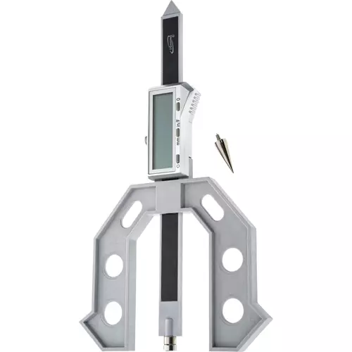 Set the heights of router bits and saw blades with greater accuracy! This 3-in-1 digital router combines the functions of three tools: a depth gauge, height gauge and thickness gauge. It is a metal rule with a Super Large LCD display, housed in a heavy-duty polycarbonate frame which allows it to stand freely. The frame allows the tool to be set at 70, 80 or 90 degrees as well as horizontally for accurate measuring. It features buttons for on/off as well as zero set functions, and it easily switches readings from inches to metric to fractions at a touch. Two hardened steel measuring anvils (flat and point) are included. Supplied with a 3V CR2032 battery and packaged in a protective plastic case.