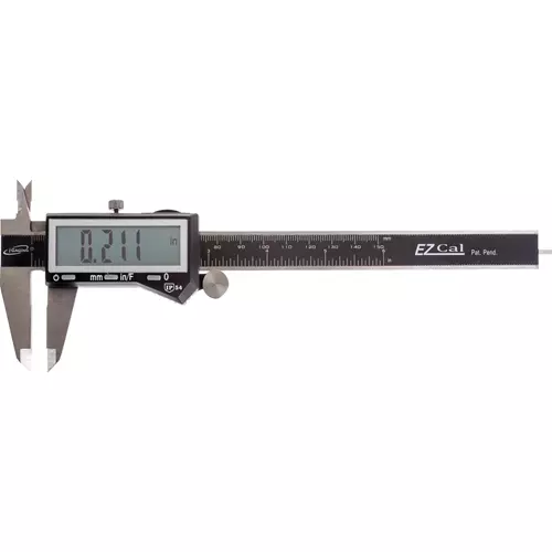 These EZ View Digital Calipers offer a large LCD display. The hardened stainless steel construction sports a precision ground finish. The accuracy is within 0.001"/6" and the readings are available in inches, millimeters, and fraction with increments of 0.0005", 0.01mm, and 1/128". Powered by a 3V CR2032 battery, included. Measures 0-6".