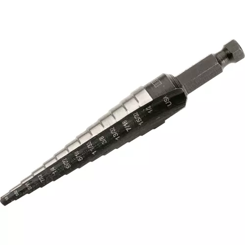 The single drill bit that does it all! Forged in industrial grade molybdenum steel and heat treated to a 61-63 hardness on the Rockwell scale, these self-starting, laser-marked step bits provide clean and dependable drilling in steel, copper, brass, aluminum, and other sheet stock materials to 1/8" thick.