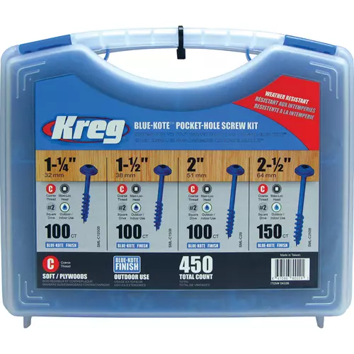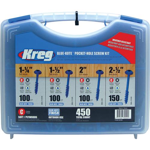 The Kreg SK03B Blue-Kote Pocket-Hole Screw Kit contains five of Kreg's most popular weather-resistant screws in a durable easy to carry case which is perfect for outside projects. All Kreg screws feature a deep #2 square drive, a needle-point self tapping tip, and a case hardened design built for strength.