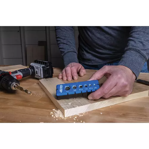 The drilling guide also automatically centers on the edge of 3/4" and 1/2" wide boards.