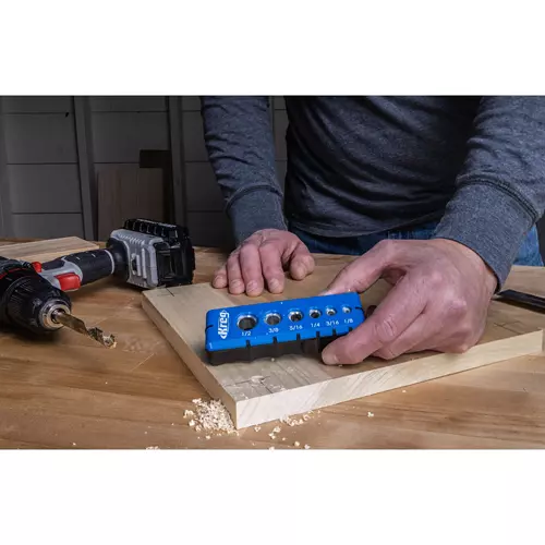 The drilling guide also automatically centers on the edge of 3/4" and 1/2" wide boards.