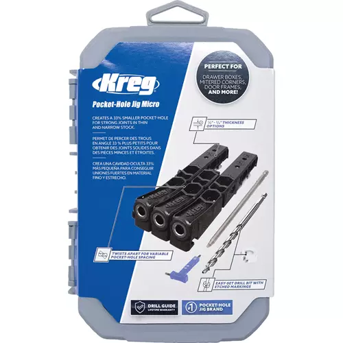With a twist-apart design for multiple thickness settings, easy-set drill bit, and hardened steel drill guides, this is the perfect solution for strong pocket-hole joints in drawer boxes, mitered corners, and more.