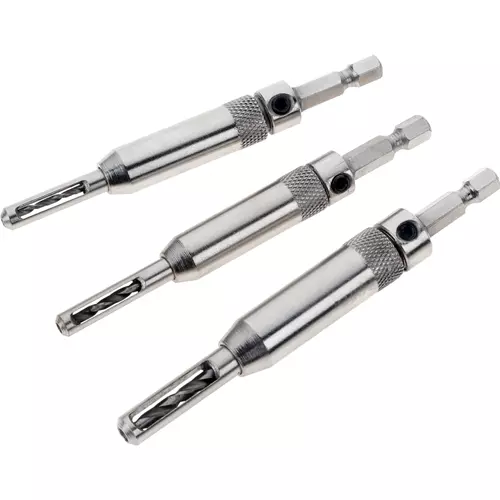 Pre-drill perfectly centered holes for proper alignment of your hinges and more. Spring-loaded drill bits are self-centering and have a 1/4" shank that fits all drills. Set includes: 5/64" for #3 and #4 screws; 7/64" for #5 and #6 screws; and 9/64" for #8 and #10 screws.