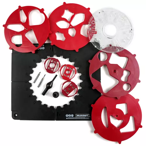 The Design/Inlay Kit is compatible with most routers up to 7-1/4" base diameter. Use the two included router bits to create small cutouts or artistic lacework. Give deck posts and cabinet doors a distinctive look, and even build one of a kind furniture pieces. Using the four provided templates, anyone can produce the patterns, cutouts, and intricate lacework pieces described in step by step detail in the supplied Design Guide. Choose from geometric, petal, heart, star, circle, and bowtie (butterfly) shapes, or use the provided pencil guide for designing your own creations!
