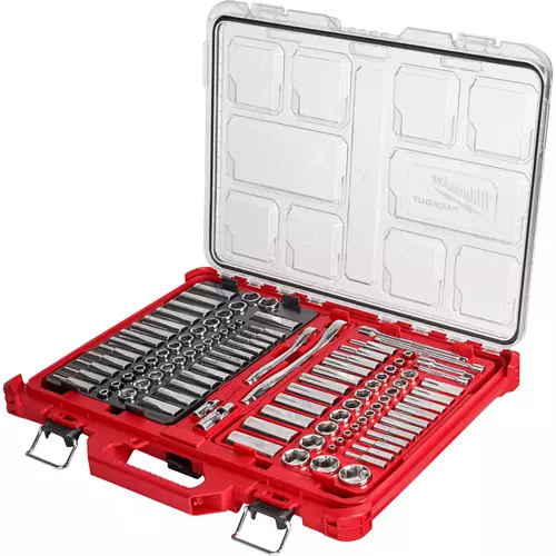 Milwaukee’s ratchet and sockets features sockets that have Four Flat™ Sides that deter rolling and are wrench compatible for maximum productivity. The 90-tooth ratchet tool provides 4° of arc swing and a slim profile for work in tighter spaces. Milwaukee stamped the sizes into each socket for easy-to-read visibility. You can keep both the 56-piece 3/8" and 50-piece 1/4" drive ratchet and socket sets organized in the included Packout™ Compact Low-Profile Organizer equipped with a clear top for easy identification of parts.
