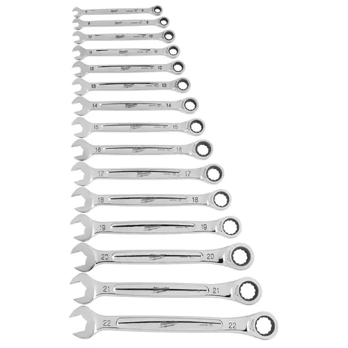 This Ratcheting Combination Wrenches feature 2.5° of arc swing, allowing our users to work quickly and efficiently in tight spaces. Our mechanic's wrenches features durable double-stacked pawls in the ratcheting mechanism offer the longest ratchet life and improved access with 144 ratcheting positions. MAX BITE Open-End Grip improves the ratchet wrench's grip on nuts and bolts, offering 25% more torque than smo0th-faced wrenches. Each combination wrench features a comfortable I-Beam handle design for improved ergonomics. Our ratcheting combination wrench set features ink-filled size labels for easy size identification, as well as quick distinction between SAE and metric sets. The 15 piece metric ratcheting combination wrench set comes in a tray designed for steel storage drawers, allowing for efficient storage with no wasted space. We stand behind our products, offering a Lifetime Guarantee on all of our combination ratchet wrench sets. Includes a 8-22mm wrench.