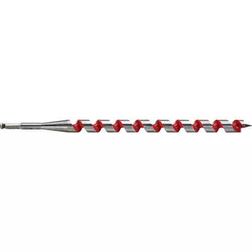 The Milwaukee® Ship Auger Bit drills through up to 2X the nails of competitive auger bits without needing resharpening. Ideal for electricians, plumbers, utilities and any trade requiring fast hole drilling in clean or nail-embedded wood. Includes induction hardened tip for added nail durability. The flutes are wider for maximum chip removal, even in deep holes. The polished and coated flute finish means chips won't stick to the bit, even when drilling in material that contains sap or glue. The through-center cutting design creates a more solid striking point against nails compared to the competitions' ahead-of-center and behind-center designs. The longer shaft length makes it easy to drill deeper or overhead without an extension.