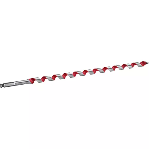 The Milwaukee® Ship Auger Bit drills through up to 2X the nails of competitive auger bits without needing resharpening. Ideal for electricians, plumbers, utilities and any trade requiring fast hole drilling in clean or nail-embedded wood. Includes induction hardened tip for added nail durability. The flutes are wider for maximum chip removal, even in deep holes. The polished and coated flute finish means chips won't stick to the bit, even when drilling in material that contains sap or glue. The through-center cutting design creates a more solid striking point against nails compared to the competitions' ahead-of-center and behind-center designs. The longer shaft length makes it easy to drill deeper or overhead without an extension.
