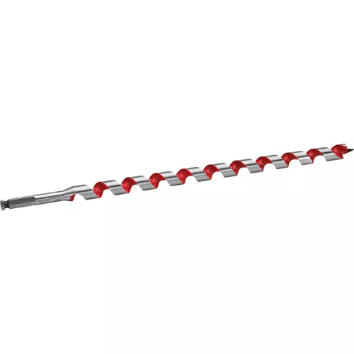 The Milwaukee® Ship Auger Bit drills through up to 2X the nails of competitive auger bits without needing resharpening. Ideal for electricians, plumbers, utilities and any trade requiring fast hole drilling in clean or nail-embedded wood. Includes induction hardened tip for added nail durability. The flutes are wider for maximum chip removal, even in deep holes. The polished and coated flute finish means chips won't stick to the bit, even when drilling in material that contains sap or glue. The through-center cutting design creates a more solid striking point against nails compared to the competitions' ahead-of-center and behind-center designs. The longer shaft length makes it easy to drill deeper or overhead without an extension.