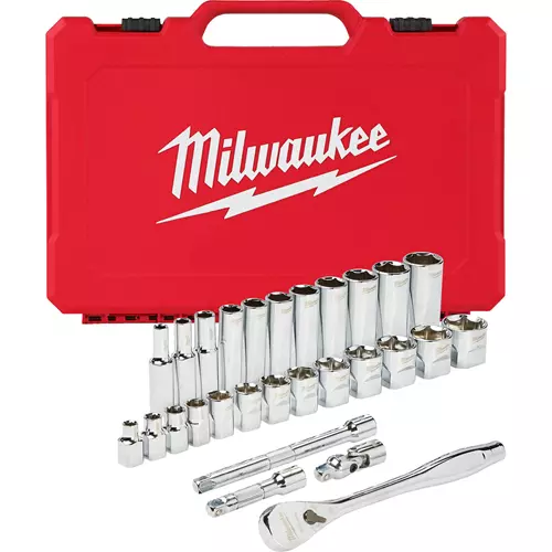 The MILWAUKEE® SAE 28 piece 3/8" drive Ratchet & Socket set is designed from the ground up, offering our users the most versatile sockets. Its innovative FOUR FLAT™ sides feature an anti-roll and wrench-ready design. The 90 tooth ratchet tool offers 4° of arc swing and a slim profile design, allowing you to work in tighter and more confined spaces, be it under the hood of a car or in the middle of a remodel. The ratchet and socket kit comes with a removable inner tray which is perfectly designed to be stored long-term in a steel storage chest. All of the sockets are stamped with SAE measurements on the flat side for easy-to-read visibility. It also comes with a durable carrying case for ultimate portability. The set comes with accessories included so that our users can get every job done, both in the garage and on the jobsite. Our ratchet and socket set is backed by our Lifetime Guarantee.