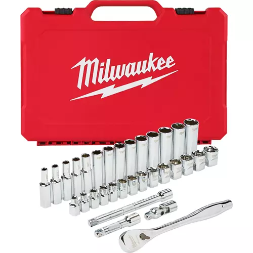 The MILWAUKEE® metric 32 piece 3/8" drive Ratchet & Socket set is designed from the ground up, offering our users the most versatile sockets. Its innovative FOUR FLAT™ sides feature an anti-roll and wrench-ready design. The 90 tooth ratchet tool offers 4° of arc swing and a slim profile design, allowing you to work in tighter and more confined spaces, be it under the hood of a car or in the middle of a remodel. The ratchet and socket kit comes with a removable inner tray which is perfectly designed to be stored long-term in a steel storage chest. All of the sockets are stamped with metric measurements on the flat side for easy-to-read visibility. It also comes with a durable carrying case for ultimate portability. The set comes with accessories included so that our users can get every job done, both in the garage and on the jobsite. Our ratchet and socket set is backed by our Lifetime Guarantee.
