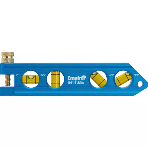 Empire's Magnetic Billet Torpedo Level is constructed of anodized aluminum alloy for strength and durability. The attractive blue level features vials that display angles of 0°, 30°, 45° and 60°. Powerful neodymium magnets provide superior holding strength so you can work without holding the level. This level features a convenient V-Groove for pipe and conduit work and a No-Dog feature to eliminate dog-legs in offsets and saddles.