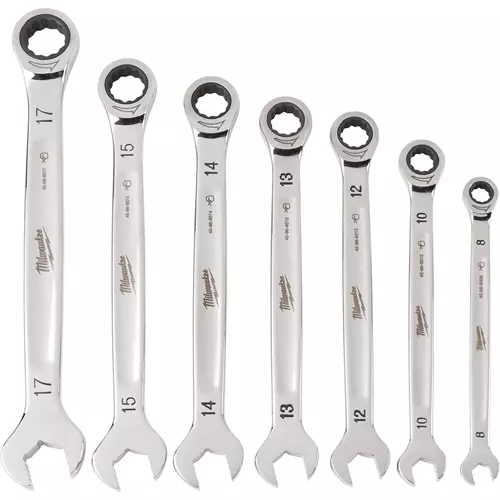 These Ratcheting Combination Wrenches feature 2.5° of arc swing, allowing our users to work quickly and efficiently in tight spaces. Our mechanic's wrenches feature durable double-stacked pawls in the ratcheting mechanism offer the longest ratchet life and improved access with 144 ratcheting positions. MAX BITE Open-End Grip improves the ratchet wrench's grip on nuts and bolts, offering 25% more torque than smooth-faced wrenches. Each combination wrench features a comfortable I-Beam handle design for improved ergonomics. Our ratcheting combination wrench set features ink-filled size labels for easy size identification, as well as quick distinction between SAE and metric sets. The 7-piece metric ratcheting combination wrench set comes in a portable locking storage tray, offering organization both on and off the job site. We stand behind our products, offering a Lifetime Guarantee on all of our combination ratchet wrench sets. Includes a 8mm, 10mm, 12mm, 13mm, 14mm, 15mm, and 17mm wrench.
