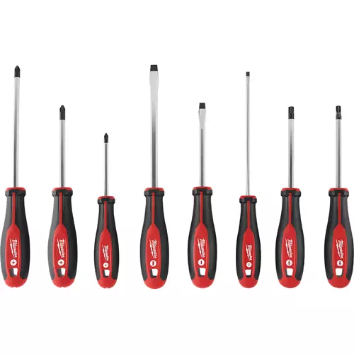 Featuring hardened tips and forged shanks, the Milwaukee® 8 piece screwdriver set with ECX™ provides professional grade solutions and durability to the user. Bit types are marked on the cap of each tool for quick identification and increased efficiency. The comfortable tri-lobe handle allows users to comfortably apply more leverage.