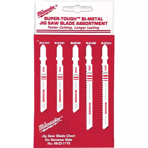 Milwaukee Bi-Metal Jig Saw blades are designed and manufactured for the professional user. Bi-metal blades last longer than high speed steel or carbon blades. Detail to the material used, tooth shape and sharpness make these blades cut clean, fast and have a longer life. These blades use a T-Shank and fit Milwaukee Jig Saws and other popular brands. Includes 5 assorted individual blades.