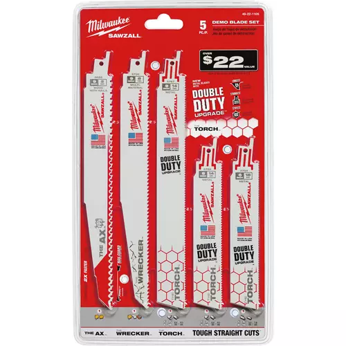 The Milwaukee® 5 piece Demolition Sawzall® blade set features an assortment of our most popular demolition blades for a broad range of professional applications. Milwaukee demolition blades are thicker for maximum durability and taller for straighter cuts. The set features The Ax™ for cutting nail embedded wood, The Wrecker™ for multi-material demolition cutting, and The Torch® for metal cutting.