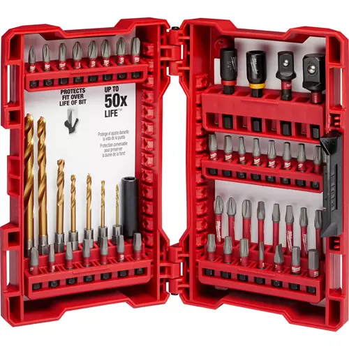 This set of SHOCKWAVE™ Impact Driver Bits (50 pc.) is engineered to be the most durable, best fitting driver bits on the market. The impact drill and drive bits feature MILWAUKEE® Wear Guard Tip™ that delivers increased wear resistance which protects the fit over the life of the bit. The Shockzone™ is optimized for each tip type and length of driver bit to absorb peak torque and prevent breaking. The Milwaukee impact driver bit set features Custom Alloy76™ steel, heat treated per tip type to extend the life of the driver bits, providing up to 50X life versus competitive impact driver bits. SHOCKWAVE™ driver bits are built to deliver extreme durability for the most demanding applications.Features:
