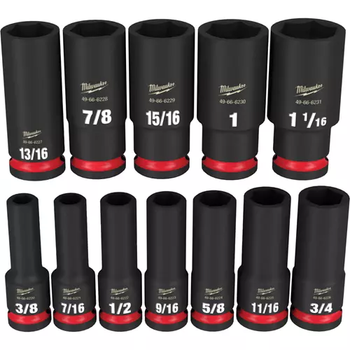 The SHOCKWAVE Impact Duty™ 1/2" Drive 6 Point Socket Set features the boldest, longest-lasting markings and extreme impact durability in high torque applications. The stamped and ink-filled size marking enables you to select the right socket every time throughout the life of the socket. These sockets are engineered with high strength forged steel for optimized performance in heavy-duty applications. The non-slip hex geometry prevents fastener rounding, and a dual-hole design and ring groove allow for easy socket attachment and removal. The storage cases are impact resistant and nest together for easy stacking and storage. All MILWAUKEE® SHOCKWAVE Impact Duty™ Sockets are backed by a Lifetime Guarantee and meet ASME industry standards.