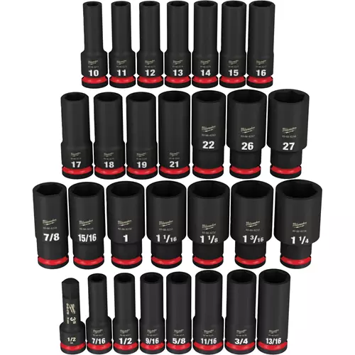 28 deep SAE and metric sockets and one extension. The following sizes are included: 7/16 1/2 9/16 5/8 11/16 3/4 13/16 7/8 15/16 1 1-1/16 1-1/8 1-3/16 1-1/4 10 11 12 13 14 15 16 17 18 19 21 22 26 27 3" Extension