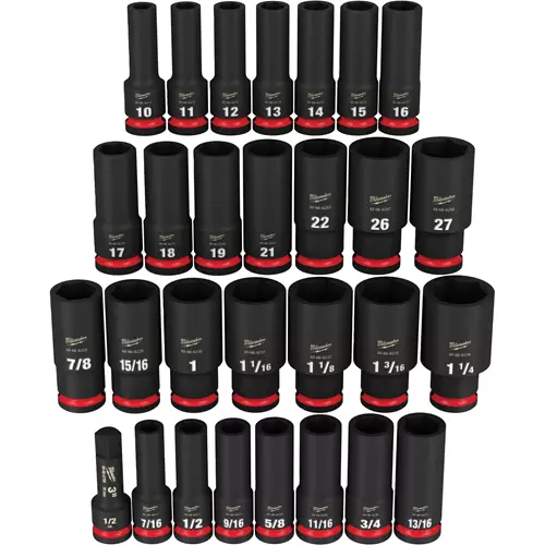 The SHOCKWAVE Impact Duty™ 1/2" Drive 6 Point Socket Set features the boldest, longest-lasting markings and extreme impact durability in high torque applications. The stamped and ink-filled size marking enables you to select the right socket every time throughout the life of the socket. These sockets are engineered with high strength forged steel for optimized performance in heavy-duty applications. The non-slip hex geometry prevents fastener rounding, and a dual-hole design and ring groove allow for easy socket attachment and removal. The storage cases are impact resistant and nest together for easy stacking and storage.