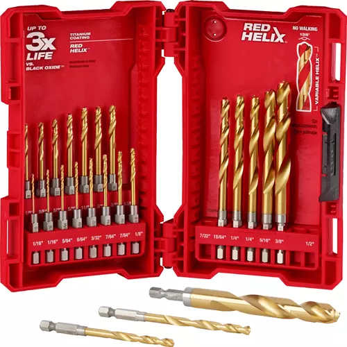 Milwaukee® SHOCKWAVE™ Impact Duty Titanium Drill Bits with RED HELIX™ are engineered for impacts and drills. Designed with a Variable Helix™ with an aggressive 35° Helix Angle which ends at 15°, the Impact Duty Titanium Drill bits with RED HELIX™ provide Rapid Chip Removal™ to limit heat buildup to stay sharper longer. The 135° split point tip delivers a precision start and prevents walking for fast, accurate holes. Titanium coating can be used in all drilling applications and gives you up to 3X more life compared to black oxide coated drill bits.