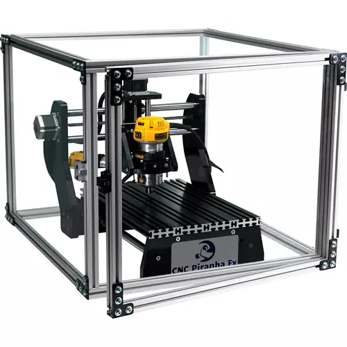 Made from aluminum, plexiglas and all steel connectors, the CNC Piranha FX/SD110 Dust Enclosure is designed to give years of service.
